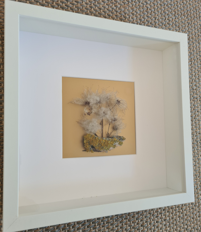... Fruchtstände der wilden Waldrebe, abgefallene Rinde mit Flechten (im Bilderrahmen)