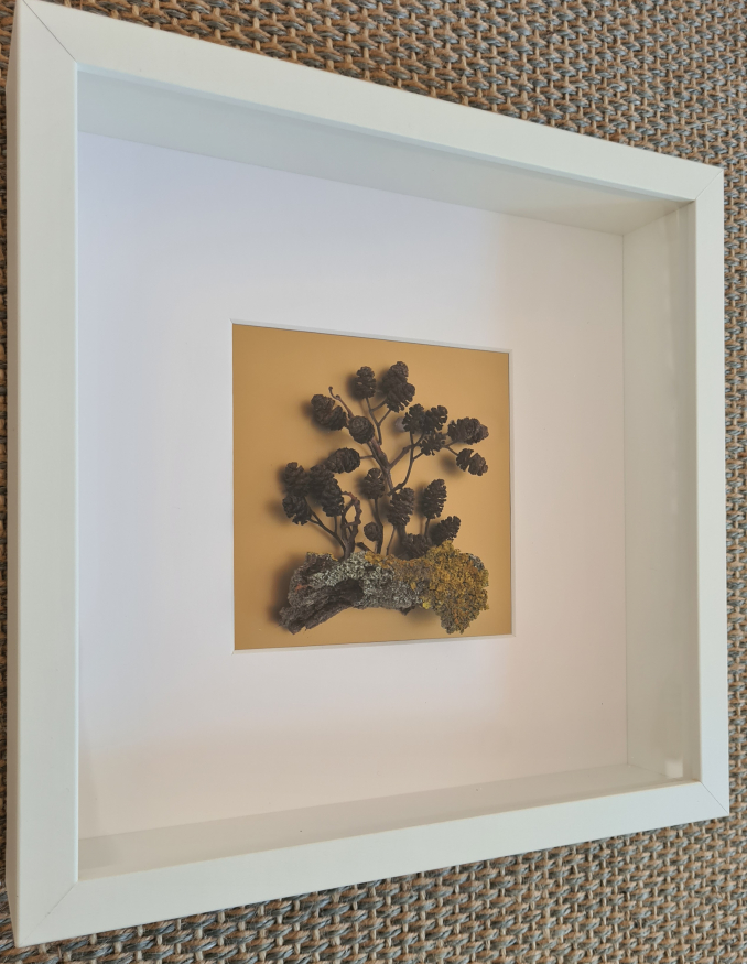 ... Fruchtständer der Schwarzerle, abgefallene Rinde mit Flechten (im Bilderrahmen)